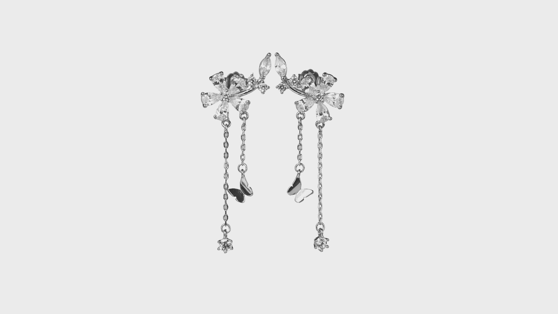 Graceful movement with a luminous trail. A slim vine of clear marquise and round zirconia rests on the ear, while two fine chains fall into tiny butterfly charms and crystal-tipped ends. Crafted in 925 sterling silver with a cool rhodium finish, the airy 3.5 × 2.0 cm drops sway softly and catch the light—elegant for weddings, festivals, and evenings.