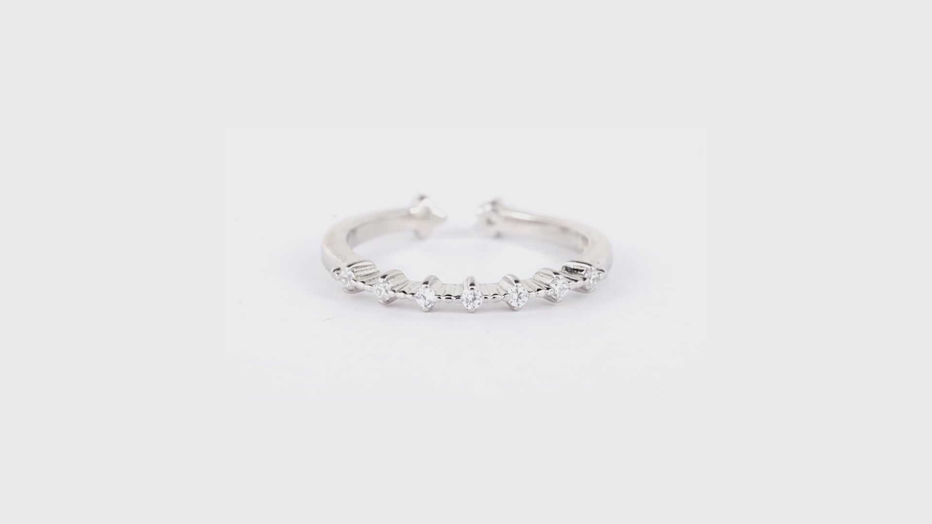 Petite Tiara Band ring in 925 sterling silver with a bright rhodium finish. A delicate crown-inspired contour is set with a fine row of brilliant cubic zirconia across a softly scalloped band. Lightweight, refined, and designed to stack, pairs beautifully with solitaire and plain bands.